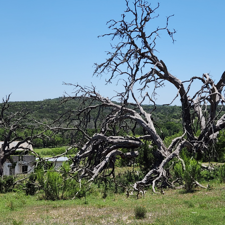 When a live oak is responding to an oak wilt infection, the dying limbs and branches in the canopy (also known as the crown) will follow certain patterns reflecting development of the disease. One important pattern is the length of time over which the crown dies. In live oaks, there is an 80 – 90% chance the tree will die within a year. A few will succumb within 30 days following the initial appearance of foliar symptoms, but more will take to 6 months or longer to die. These rates of symptom development in a group of trees may vary in space depending on the size of the disease center and numbers of trees. In a large oak wilt center for example, clusters of trees may survive in various stages of canopy loss, even when nearby trees may be mostly dead. On average 10 – 20% can be expected to survive for decades with no treatments, although the canopies of most will be decimated and no longer serve as useful landscape specimens.