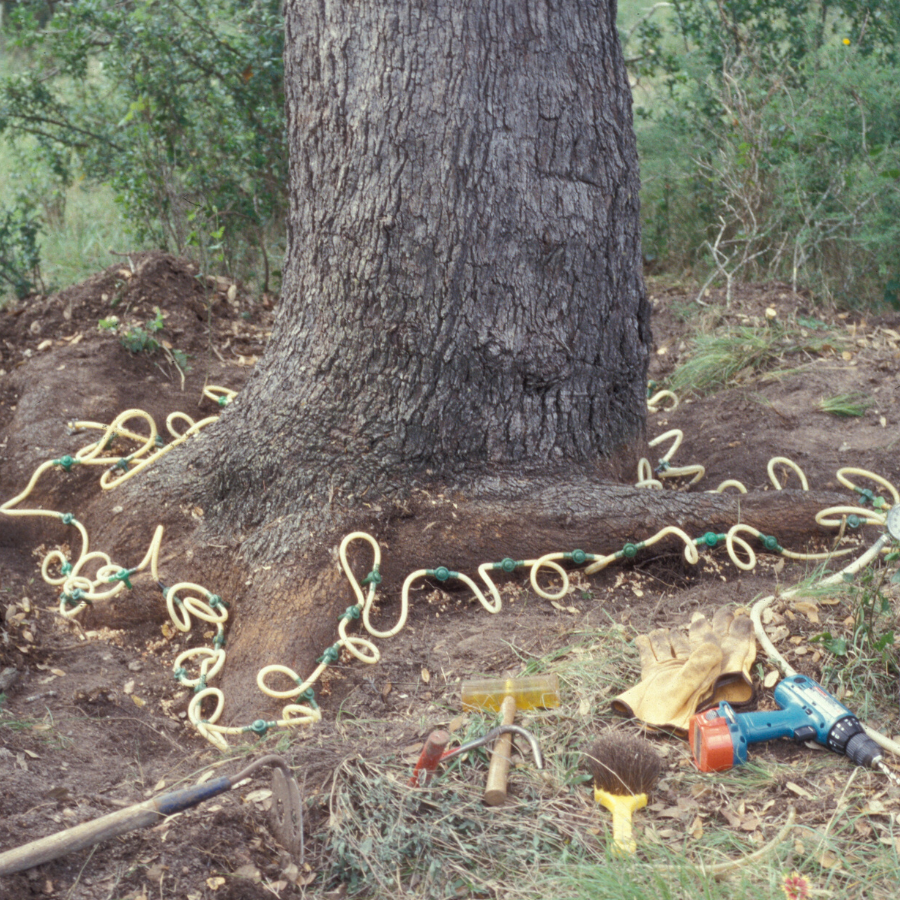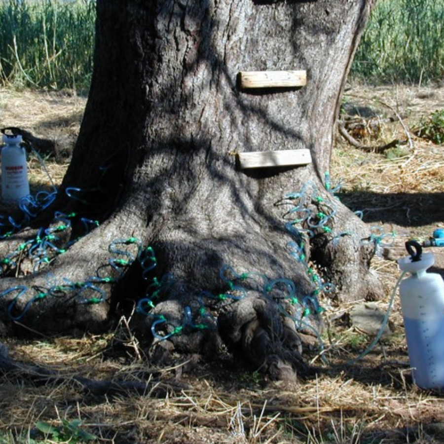 The objective of injecting is to deliver the fungicide into the sapwood of the trees, also known as the vascular system where the fungus grows and kills the tree. There are different fungicide formulations and injection systems available for injecting trees, each with various advantages depending on the specific circumstances of a given case. Some systems have been proven effective with systematic, published research. Other injection practices have been developed in the tree health industry and are supported by the personal experiences of the arborist recommending them. When hiring an arborist to treat a tree for oak wilt with injection, efforts should be made to verify the treatment being recommended has a proven track record of success.